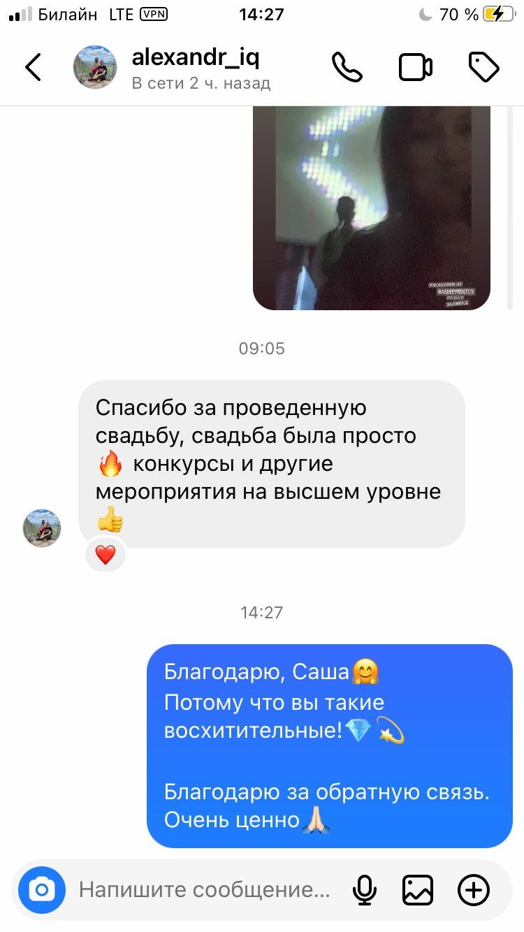 Екатерина Кузьмина: 21 июля у нас прошло грандиозное событие - наша долгожданная свадьба 💒 к которой мы готовились пол года. Благодаря Вам, Анна она прошла просто на высшем уровне, всё прошло так как надо!!! Мы ничуть не пожалели, что выбрали именно вас 🤗все гости были очень довольны, всем было весело и легко) Спасибо вам огромное за то что были с нами в этот день!!! Хочется пожелать процветания, вы очень эффектная, яркая, а это не маловажные качества для ведущего!!! Всем будущим молодожёнам, которые читают этот отзыв могу с уверенностью сказать, что Анна - лучшая ведущая!!! 🤩😉
