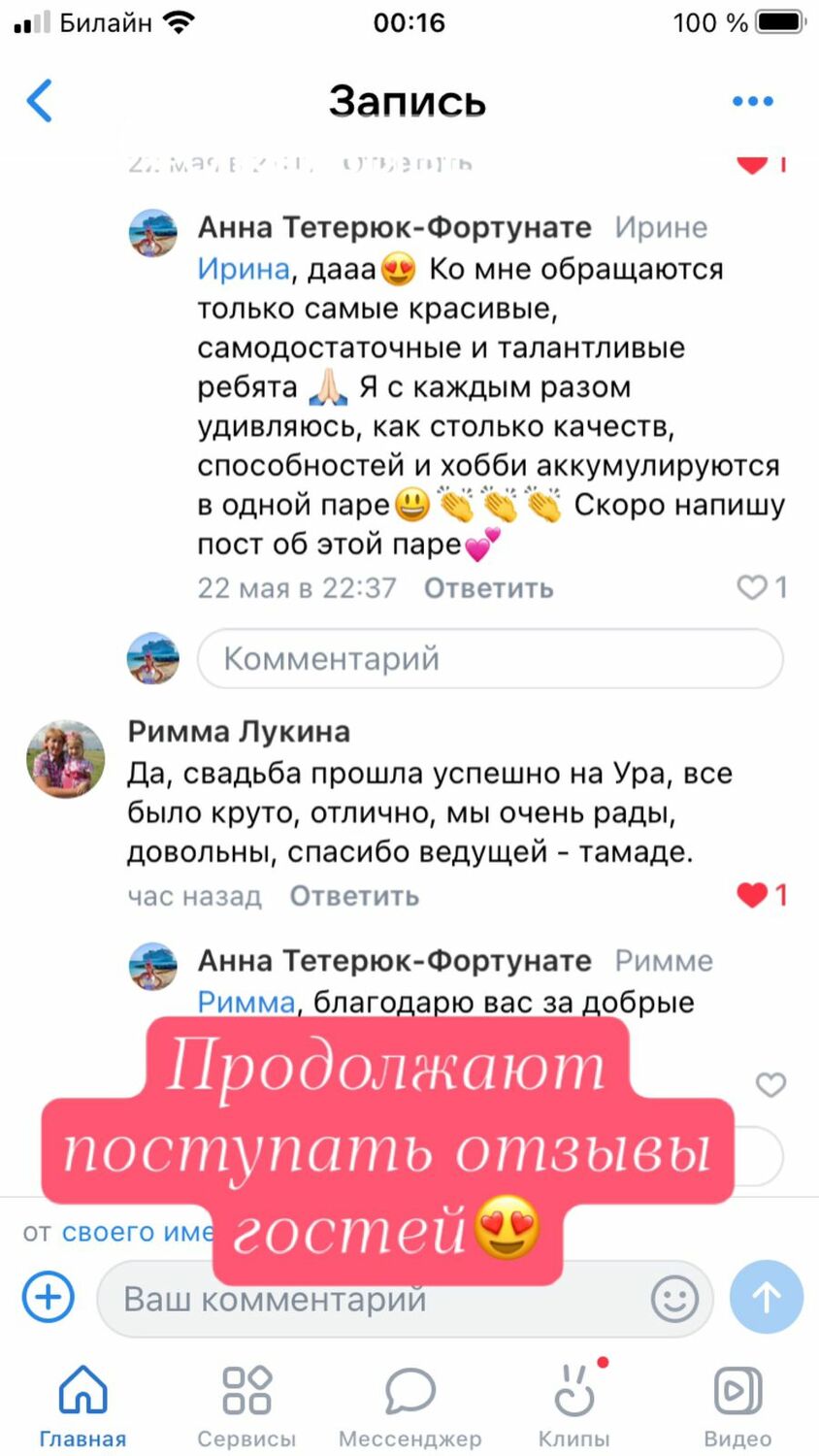 Текст отзыва...Карина Мазлумян : Дорогая наша Анна , мы вам безумно благодарны , что в самый важный для нас день , мы нашли именно вас !!! Вы потрясающая , великолепная , харизматичная , искренняя, душевная , красотка нереальная, все от вас просто в диком восторге !!!!! Не знаю как бы мы без вас справились 🤷♀️ все прошло просто чудесно , душевно , просто как в сказке, даже не хотелось прощаться 😅😘❤❤❤😍😍😍😘😘😘 👏 👏👏
